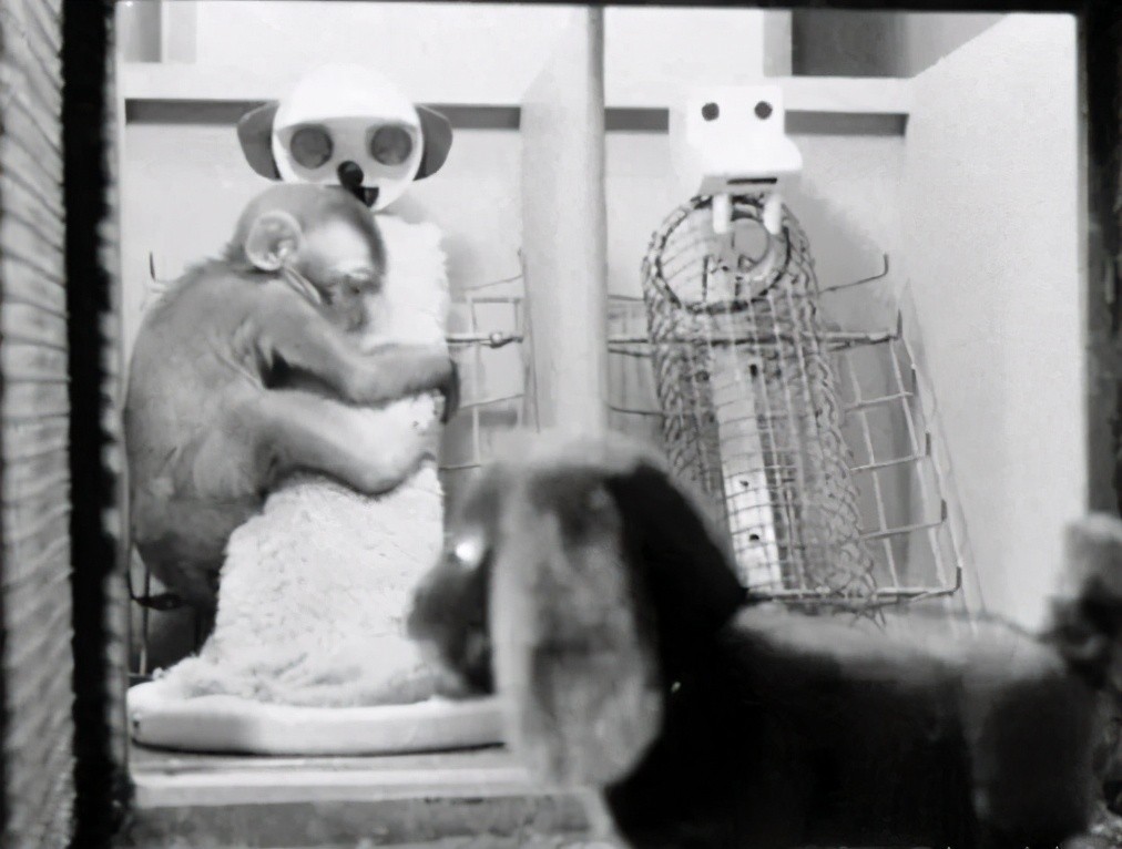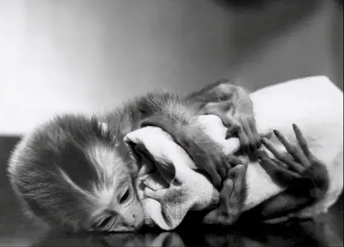 他发现幼猴对于原本铺在笼子底部的绒布产生极大的依恋。它们会微缩在一角,紧紧抱着绒布。而当实验人员要拿走绒布时,却受到幼猴的极大反抗。它们会吱吱乱叫,发脾气,甚至咬实验人员。相反,如果实验人员只是拿走奶瓶,幼猴的反应却没有这么大。而且更严重的是,被剥夺母亲的幼猴普遍胆小,智力发育迟缓。