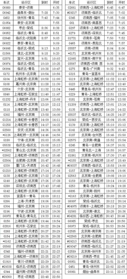 从6月26日起,K372次列车取消在泰山站停车;从6月24日起,新增日照至济南的K8252次,从6月25日起,新增济南至日照的K8251次。另外,经停泰山站的19趟列车,到开时刻发生变化。从6月26日起,温州至北京的K102次列车,到达时间为8点09分,开车时间为8点13分;从6月26日起,长沙至济南的K1074次列车,到达时间为8点30分,开车时间为8点36分;从6月24日起,日照至济南的K8252次列车,到达时间为18点01分,开车时间为18点05分;从6月25日起,上海至呼和浩特的Z268次列车,到达时间为23点42分,开车时间为23点45分;从6月27日起,广州东至青岛的Z168次列车,到达时间为0点09分,开车时间为0点18分;从6月27日起,南宁至青岛的K1138次列车,到达时间为0点50分,开车时间为0点56分;从6月26日起,杭州至齐齐哈尔的K48次列车,到达时间为6点43分,开车时间为6点48分;从6月26日起,上海至沈阳北的K188次列车,到达时间为7点03分,开车时间为7点05分;从6月26日起,上海至阜新南的1228次列车,到达时间为7点58分,开车时间为8点02分;从6月26日起,牡丹江至温州的K551次列车,到达时间为11点36分,开车时间为11点40分;从6月26日起,沈阳北至温州的K347次列车,到达时间为12点03分,开车时间为12点15分;从6月26日起,齐齐哈尔至杭州的K47次列车,到达时间为18点,开车时间为18点03分;从6月25日起,济南至日照的K8251次列车,到达时间为16点16分,开车时间为16点19分;从6月25日起,济南至广州的T179次列车,到达时间为17点53分,开车时间为17点56分;从6月25日起,青岛至西宁的Z273次列车,到达时间为18点46分,开车时间为18点51分;从6月25日起,青岛北至广州东的Z167次列车,到达时间为18点55分,开车时间为18点57分;从6月25日起,北京至上海的1461次列车,到达时间为19点17分,开车时间为19点20分;从6月27日起,牡丹江至日照的K1449次列车,到达时间为1点40分,开车时间为2点18分;从6月26日起,阜新南至上海的1227次列车,到达时间为6点52分,开车时间为6点54分。新图实施后,泰山火车站办理客运业务的旅客列车上行30列,下行29列,共计59列,与原图相比增加1列;高铁泰安站新增开列车50列,车次和列车时刻调整较大,高铁泰安站工作人员提醒广大旅客朋友,购票、乘车外出时,要及时关注列车时刻表,合理安排出行时间及车次。