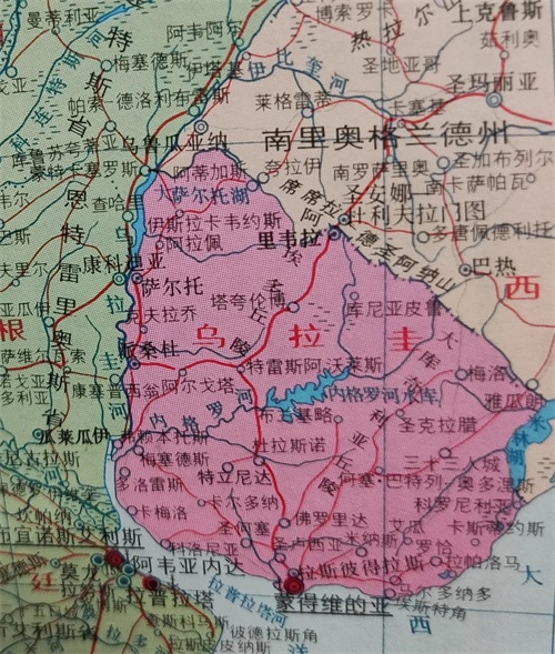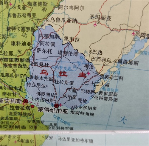 【地理】 位于南美洲东南部,乌拉圭河与拉普拉塔河的东岸。北邻巴西,西界阿根廷,东南濒大西洋。海岸线长660公里。地势平坦,丘陵和草原相间,平均海拔116.7米。属温带气候,1~3月为夏季,气温17℃~28℃,7~9月为冬季,气温6℃~14℃。年降水量由南至北从950毫米递增到1250毫米。