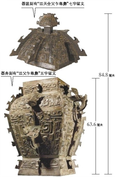 皿方罍是商代晚期盛酒器,该器通高84.8厘米、器身高63.6厘米。罍盖呈庑殿顶形,罍身作长方口,直颈,高圈足。全器以云雷纹为地,上饰兽面纹、夔龙纹、凤鸟纹。肩部两侧装饰双耳衔环,正面腹部下方置一兽首鋬。四面边角及各面中心均装饰突起的长条钩戟形扉棱。器盖刻有“皿天全父乍尊彝”七字铭文,器身则为“皿父乍尊彝”五字铭文,“皿”是器主族氏名,“而全”才是器主名字,“己”,是器主“而全”先父受祭拜的庙号之名。皿是商周时期的一个很有影响的大族,1977年陕西陇县韦家庄发现了一件皿氏族人的青铜簋,年代与皿方罍相同。这件簋出土于一座西周贵族的墓中,其主人与皿方罍的主人,显然是同族人。