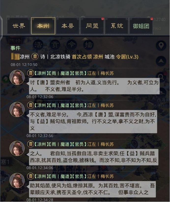 而更优秀的战争檄文,除了达到基本效果之外,还可以煽动社会舆论。比如本区【唐盟】的成员就是见檄文有理有据,纷纷弃暗投明,加入了凉州【逍遥楼】。这就是通过檄文造势的高明之处。