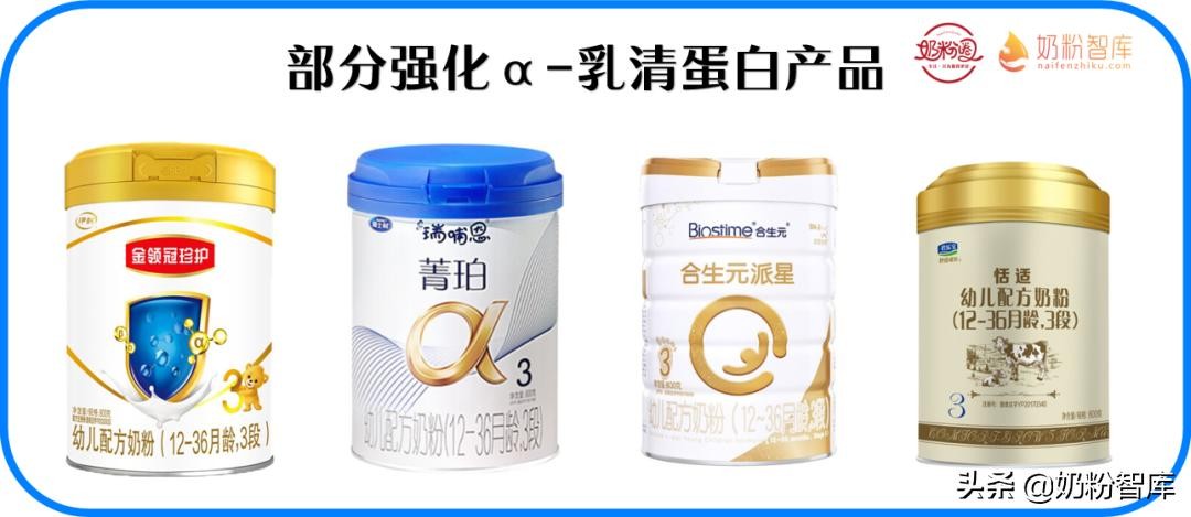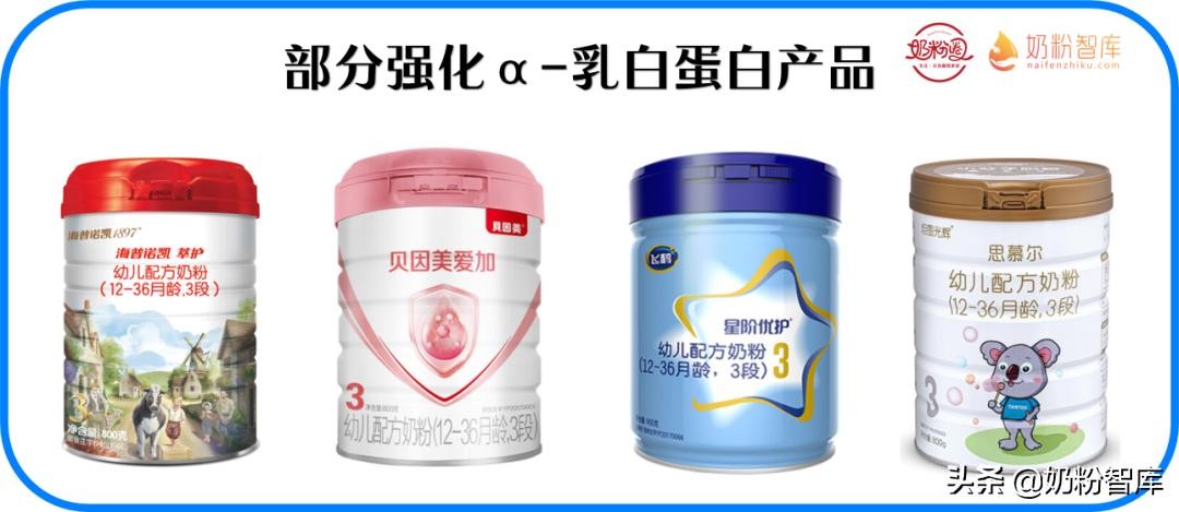 α-乳白蛋白是一种结构紧密的钙结合球蛋白,分子质量约为14200道尔顿,富含人体必需氨基酸,对宝宝的生长发育发挥着重要作用。目前贝因美爱系列(贝因美爱加、童臻等)、飞鹤系列(飞鹤星阶优护、臻爱飞帆、精粹贝艾儿等)、海普诺凯1897萃护、坦途思慕尔等均添加了α-乳白蛋白。