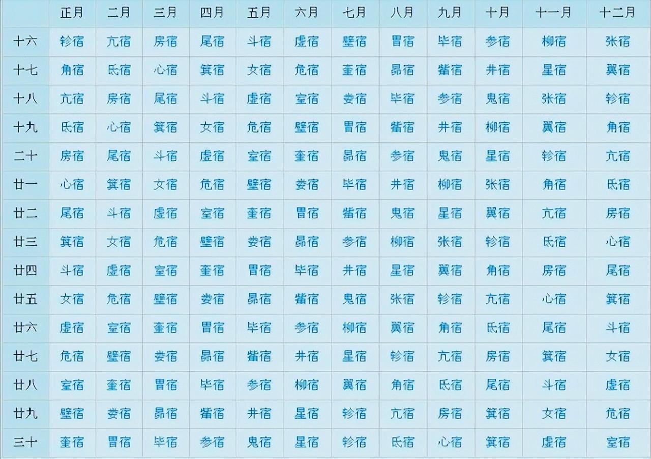 农历正月十七、二月十五、三月十三、四月十一、五月初九、六月初七、七月初四、八月初一、八月廿八、九月廿六、十月廿四、冬月廿一、腊月十九出生,星宿即属角木蛟。