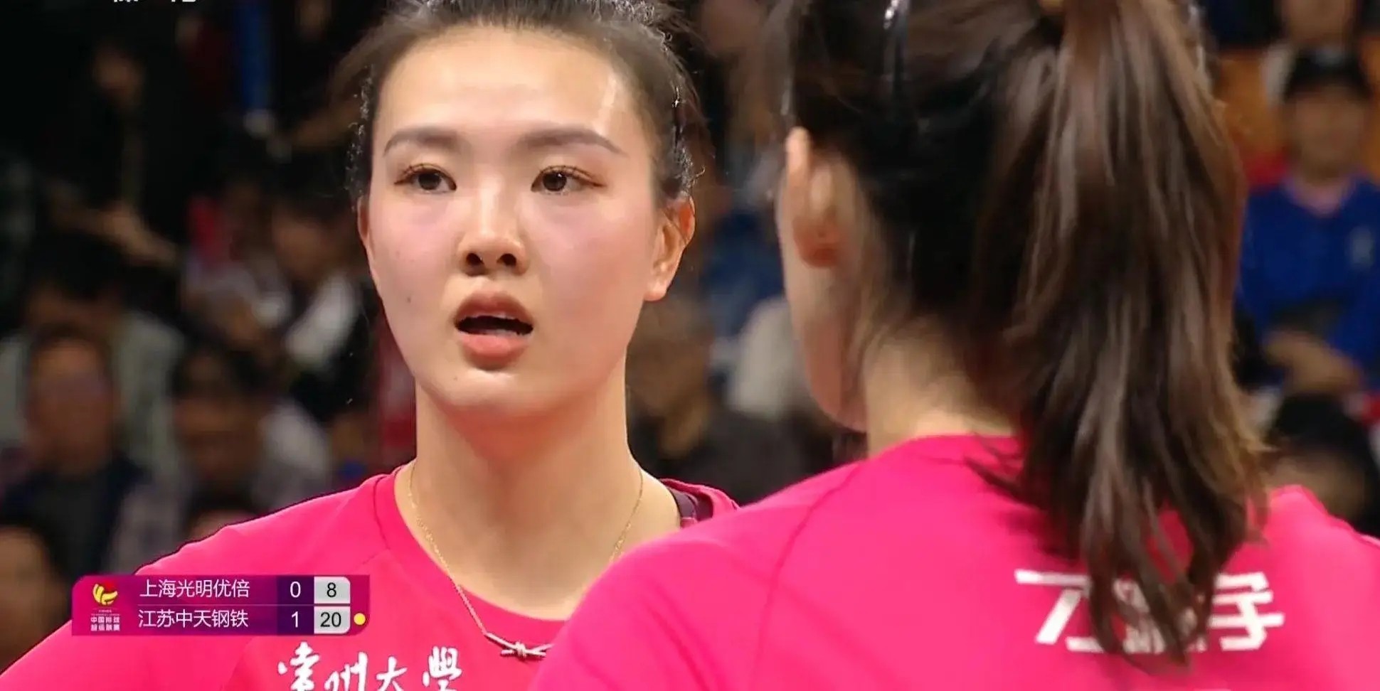 在这一局中,江苏女排的副攻万梓玥犹如一颗璀璨的新星,闪耀全场。她身高 1.96 米,在场上具有天然的优势,她的每一次起跳都仿佛能触摸到天空。在一次关键的拦网中,万梓玥准确地判断出上海女排进攻球员的意图,她迅速起跳,双手高高举起,以一种不可阻挡的气势将球拦死在对方场地,这一精彩的瞬间让全场观众为之沸腾。全场比赛,万梓玥凭借着出色的发挥,4 次拦网拦死上海队,成为全场拦网得分最多的队员,拿到了 7 分。她的出色表现,不仅为江苏女排的胜利立下了汗马功劳,也让人们看到了她巨大的潜力。