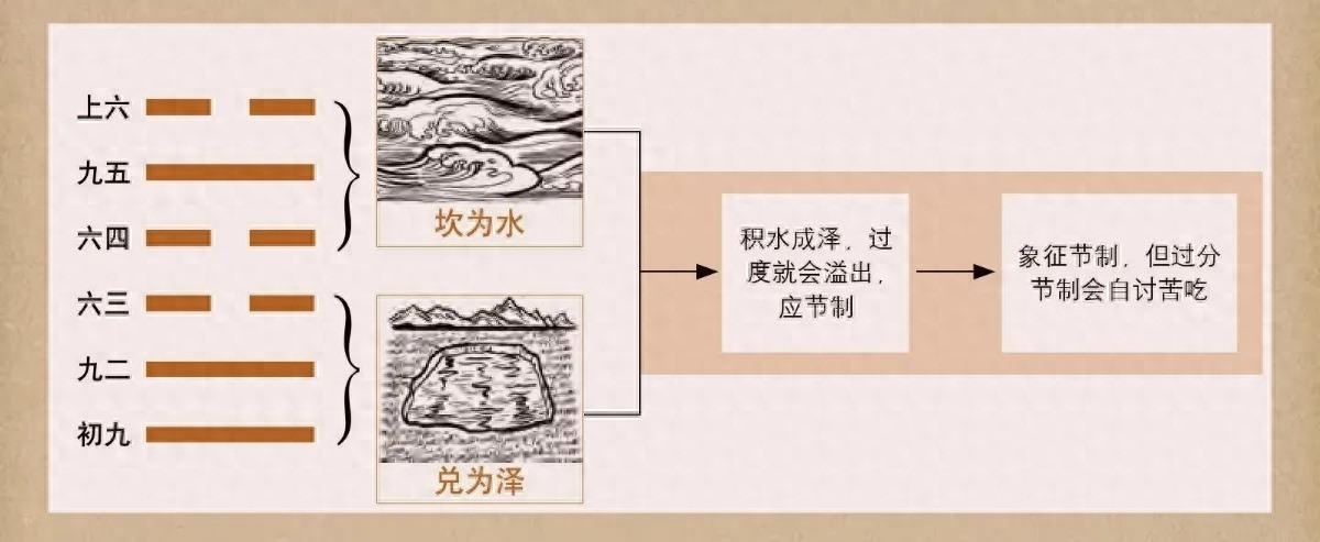 从卦象上看,外卦坎为水,内卦兑为泽,泽上有水。水会由高至低流动,如果经过一个浅坑,水便会被积蓄而停止流动。沼泽比地面要低,可以蓄水。积水成泽便是节卦的大形象。节制是自然与人类社会共有的规律,刚柔相节,生成春夏秋冬四时,冬不能无限长,以春节制,夏也不能无限长,以秋来节制。