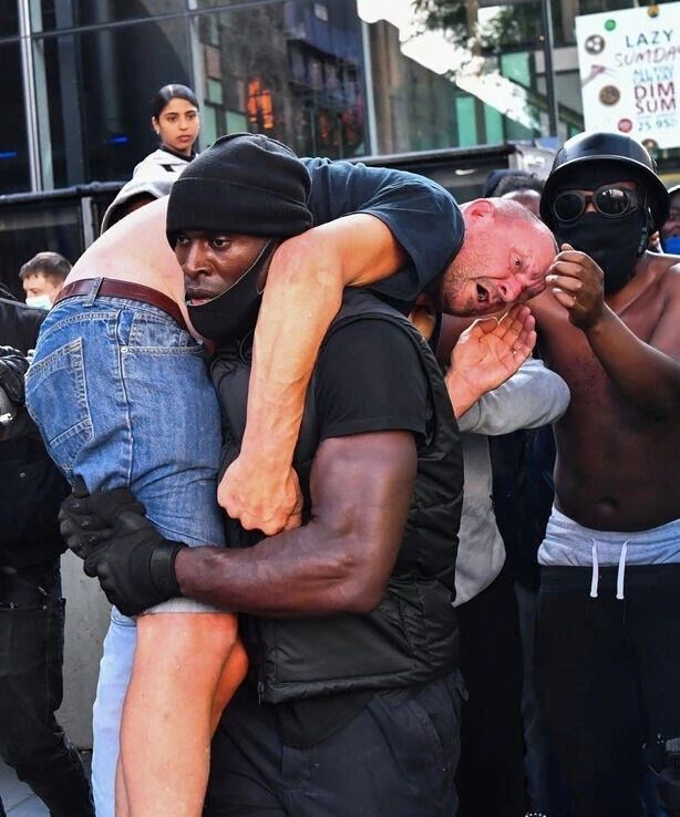 英国伦敦的黑人人权活动中,一名黑人抗议者扛着一名受伤的白人反抗议者寻求医疗帮助!人性,就是这么复杂…