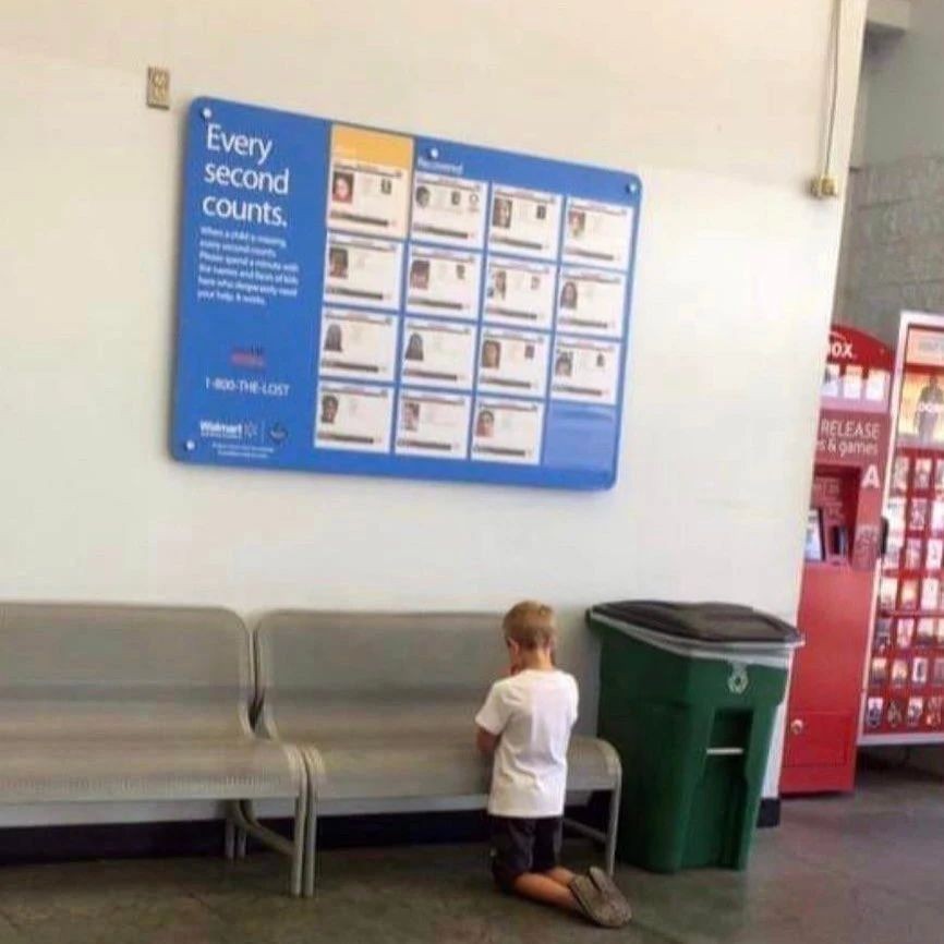一个男孩在海报前为失踪儿童祈祷,小孩子的心灵总是那么的纯粹…