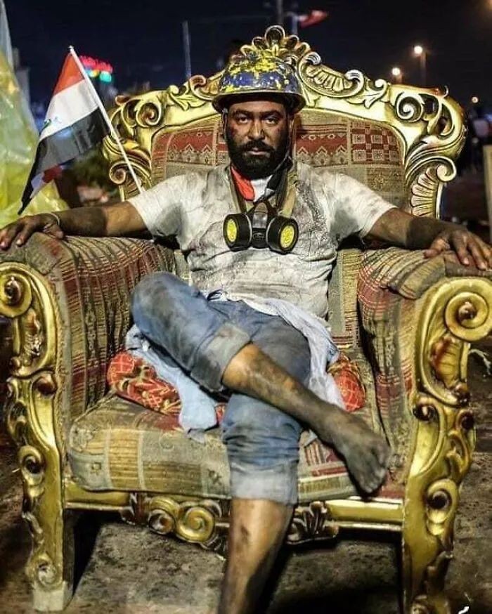一名脏兮兮的伊拉克抗议者,坐在了令他们失望的民选官员的奢华椅子上…