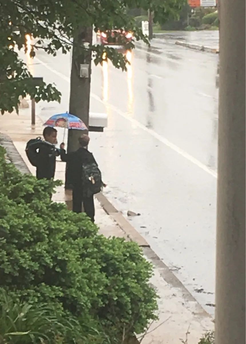 孩子问妈妈今天可不可以早点去等公交,因为他看到外面站着一个浑身湿透没有带伞的小男孩…