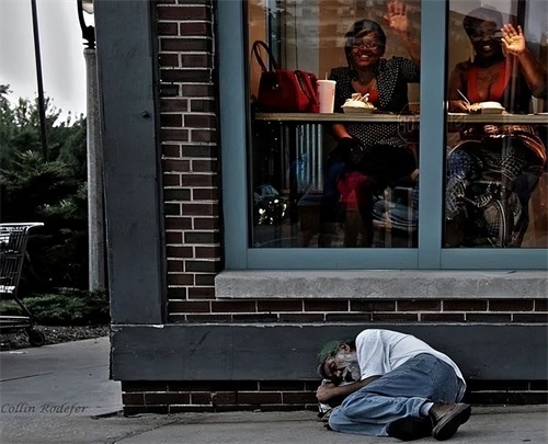 美国威斯康星州,一名无家可归的流浪者躺在一家餐厅外,人类的悲欢并不相通…