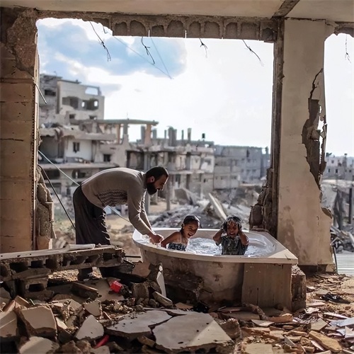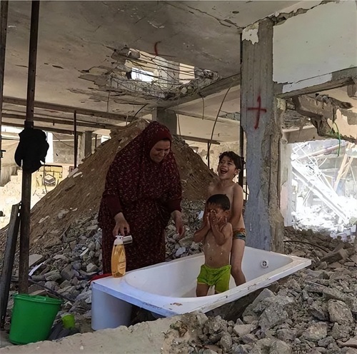 巴勒斯坦加沙,一位父亲在满目疮痍的家园中,为自己的两个女儿洗澡,对于世界某些地区的人们来说,和平是一种非常珍贵的东西…