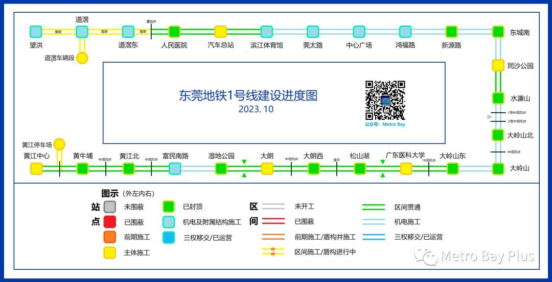 Metro Bay团队于2021年5月发布东莞地铁1号线的首张建设进度图;从2022年2月开始,随着新线动工,Metro Bay新增发布2号线三期建设进度图。