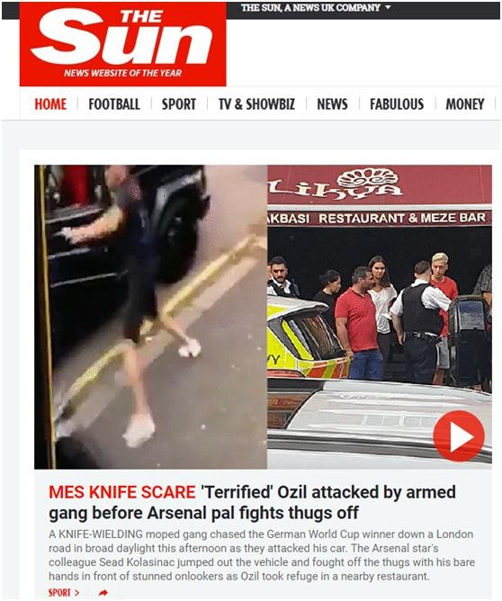 《太阳报》:“被吓坏的”厄齐尔被武装团伙攻击,阿森纳队友将歹徒赶走