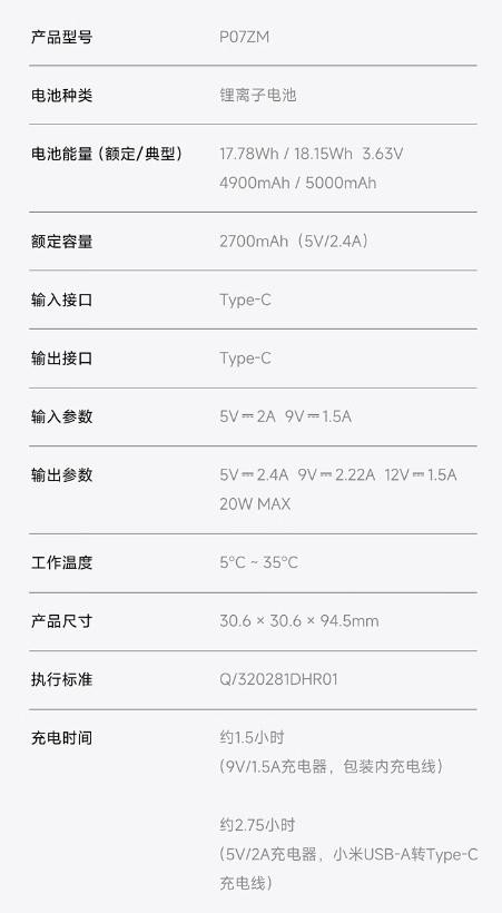 该充电宝额定容量为 2700mAh (5V 2.4A),采用 21700 电芯,配备 Type-C 接口可双向快充,最高 13.5W 输入和 20W 输出,可为 iPhone 13 快速充电,30 分钟即可充电至 43%;也可为小米 Civi 2 充电 80%。
