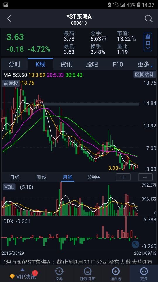 大东海A现在披星戴帽*st东海A,市值13.18亿,截止到8月31日股东人数大约为3万