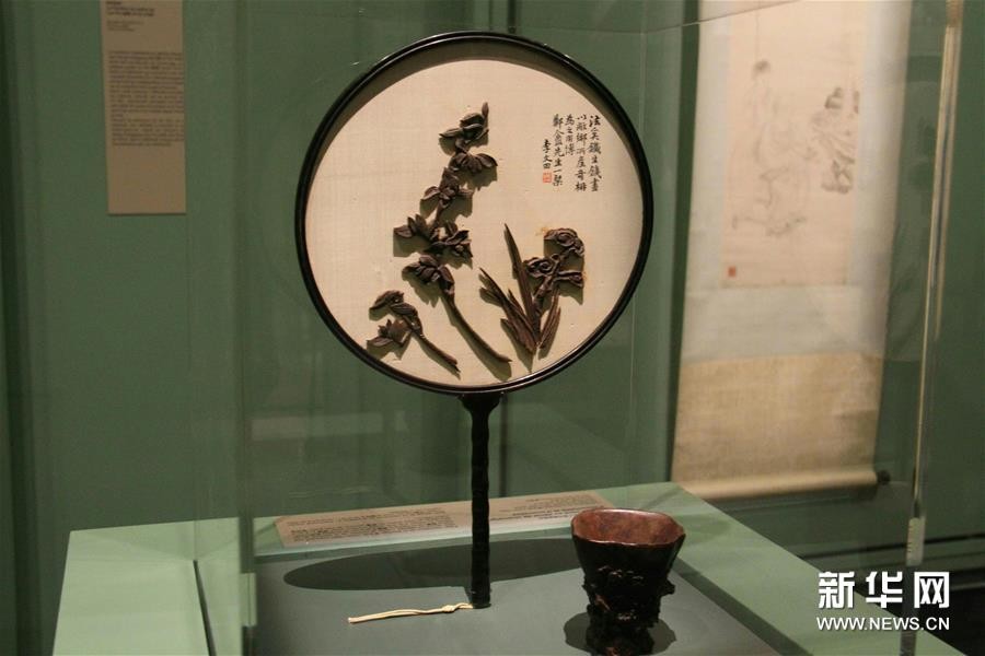这是3月8日在法国巴黎市立赛努奇亚洲艺术博物馆举行的“中国芳香:古代中国的香文化”预展上拍摄的清代沉香木雕扇。 新华社记者张曼摄