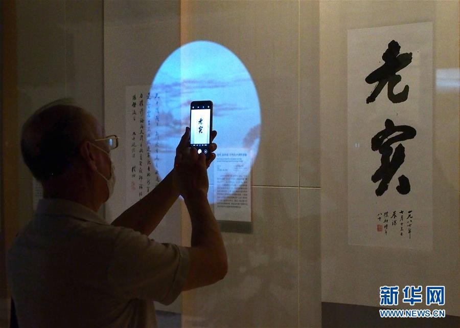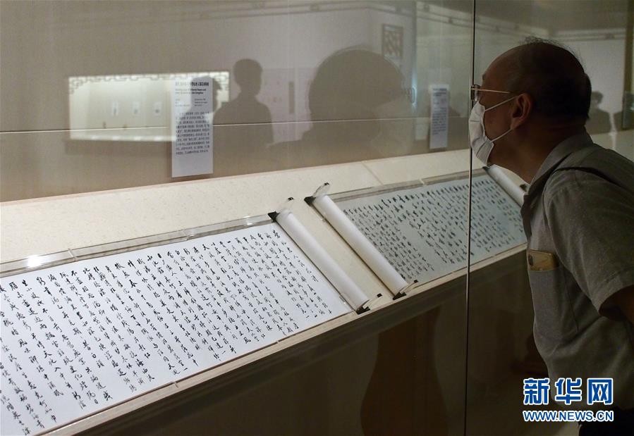 5月20日,观众在上海博物馆参观“无尽意——赵朴初书法艺术展”。 当日,“无尽意——赵朴初书法艺术展”在上海博物馆开幕。展览为期约两个月,展出赵朴初各个时期的书法作品及文献遗物等。 新华社记者 任珑 摄