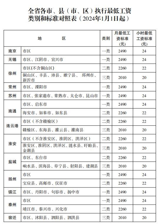 江苏省人力资源和社会保障厅1月15日下发通知,根据《最低工资规定》(原劳动保障部令第21号)和《江苏省工资支付条例》规定,经省人民政府同意,从2024年1月1日起调整全省最低工资标准。