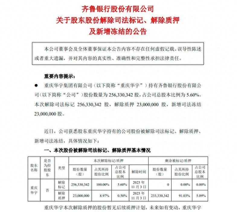 齐鲁银行:股东重庆华宇解除质押2300万股,并新增司法冻结2300万股