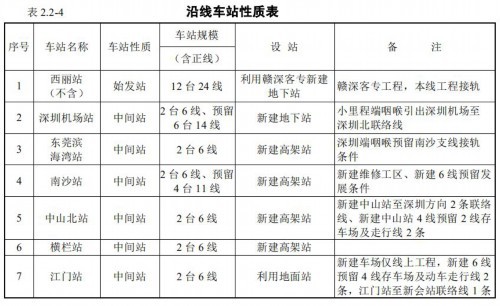 其中西丽站、深圳机场站为地下站,东莞滨海湾站、南沙站、中山北站、横栏站为高架站,江门站为地面站,西丽站纳入西丽至光明城项目建设,另结合广珠城际铁路中山站至深江铁路深圳方向联络线引入,对既有中山站进行改扩建。其中,深圳机场站为6台14线规模,采用地下2层方案。