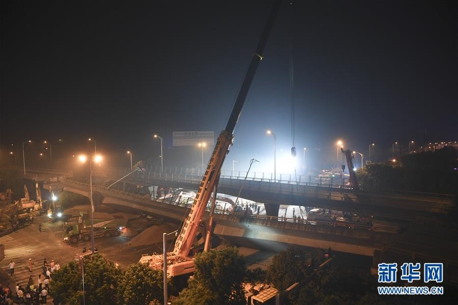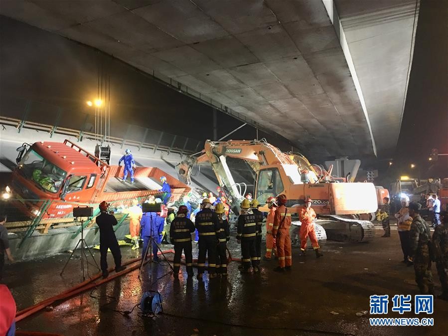 10月10日,救援人员在事故现场救援。 10月10日傍晚,江苏省无锡市一高架桥桥面倒塌,三辆小车被压。 据无锡市公安局锡山分局发布的信息,10日18时10分左右,312国道上海方向K135处、无锡市锡港路上跨桥的桥面倒塌,经现场初步勘测,桥下被压