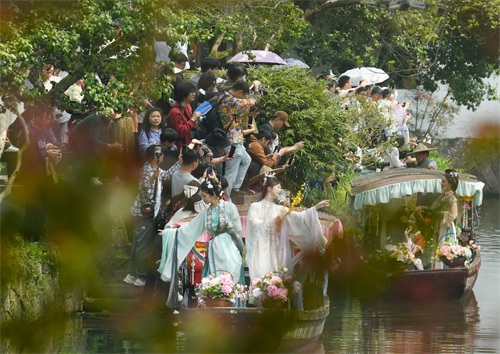 当日,杭州西溪湿地一年一度的花朝节开启,十二花神花船巡游、古戏台花神迎春等仪式向游客展示花朝节的传统习俗,展现江南春日浪漫。