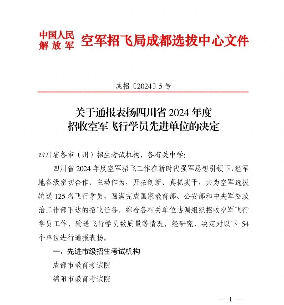 江油中学喜获“四川省2024年度空军招收飞行学员‘优质生源学校’”荣誉称号