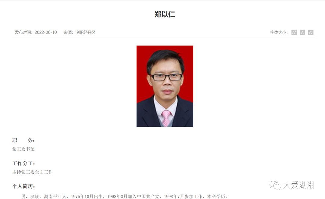 浏阳经济技术开发区官网显示,媒体人出道的郑以仁已任浏阳经济技术开发区党工委书记。