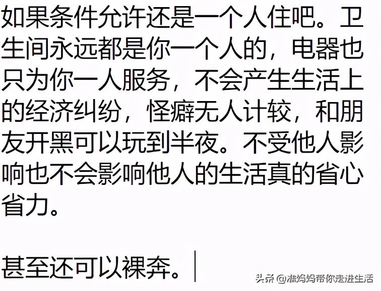 你不用担心有人跟你抢厕所,你不用等别人刷牙,不用等别人洗衣服,自己想什么时候刷就什么时候刷,想干什么就干什么,完全不用考虑别人,完全有个人的空间和时间