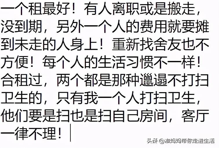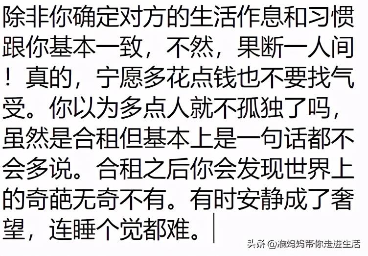 只能说每个人都不一样,能互补,志同道合就住在一起吧。其他就算了,没必要省钱,能气出病来