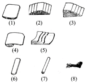 夹板固定除夹板外,还需压垫,压垫有用软纸叠成的,但作者喜用脱脂棉剪成,因棉花较软纸更柔软,不易造成压伤。压垫的形状是根据肢体部位及特殊要求,常用有以下几种形状(图1)。