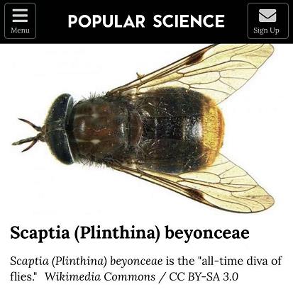 命名为“碧昂丝(Scaptia beyonceae)”。因为这种牛虻不仅身材曼妙,而且下腹部密布着金黄色细毛,研究人员形容其为“苍蝇界古往今来第一天后”,所以,以此来向流行音乐天后碧昂丝致敬。