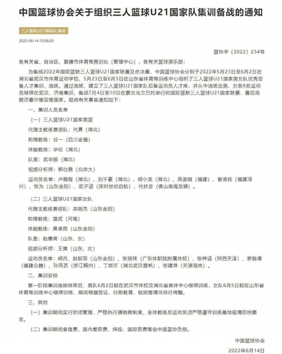 6月14日,中国篮协公布了三人篮球U21国家队集训名单,陕西天泽女篮张梓涵一路过关斩将,成功入选。据悉,此次集训是为了备战7月4日至10日在蒙古乌兰巴托举行的国际篮联三人篮球U21国家联赛,赛后将顺访塞尔维亚等国家。