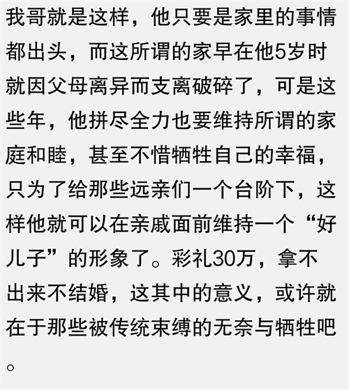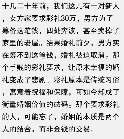 我参加了一场婚礼,女方要求男方支付30万的彩礼,男方因拿不出这笔钱而放弃了婚礼。就在这时,我看到新郎的母亲泪眼婆娑,而新娘则面无表情地站在一旁。我就这么默默地关掉了电视,心里想,彩礼的意义,或许不仅仅是一笔钱那么简单,它背后隐藏的是对家庭责任的考量和对传统文化的尊重。可现在,我却看到的是金钱的较量,真是让人感慨万千。这么多年了,我还是坚信婚姻应该建立在爱情和责任的基础上,而不是金钱。