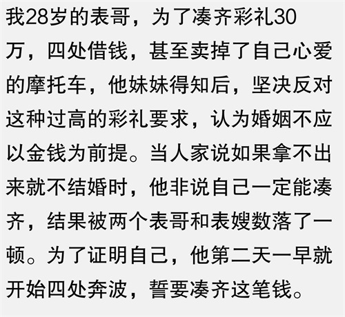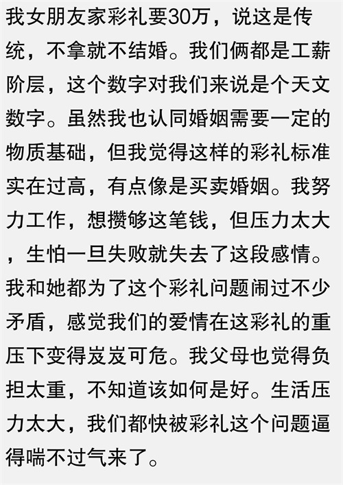 我男朋友家要求彩礼30万,说拿不出来就不结婚,我家里条件一般,实在凑不齐,他妈妈就不同意,我男朋友也不支持,我为了爱情妥协,找朋友借了钱,没想到他妈妈后来又变卦,说我没诚意,我男朋友也对我失望,我为了彩礼的事差点和家里闹翻,最后还是分手了,我朋友借钱给我,她老公意外受伤,欠了债,我工作失误被公司辞退,现在还欠着债,生活压力巨大,真不知道彩礼的意义在哪里?