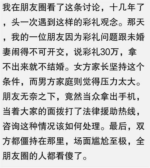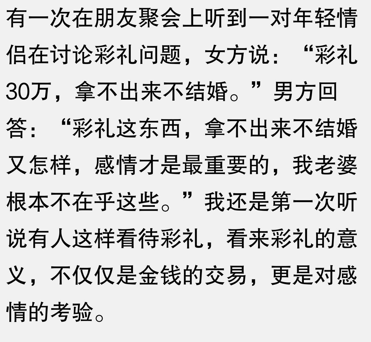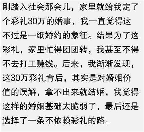 等车的时候,听到两个女人讨论彩礼问题,其中一个说:“彩礼30万,拿不出来就不结婚。”我当时心想,这种观念真是有点过分了,彩礼的意义难道就是为了衡量一个人的价值吗?后来她们又聊起了其他的事情,我才意识到,原来她们说的是彩礼的象征意义,而不是实际金额。看来我又误会了。