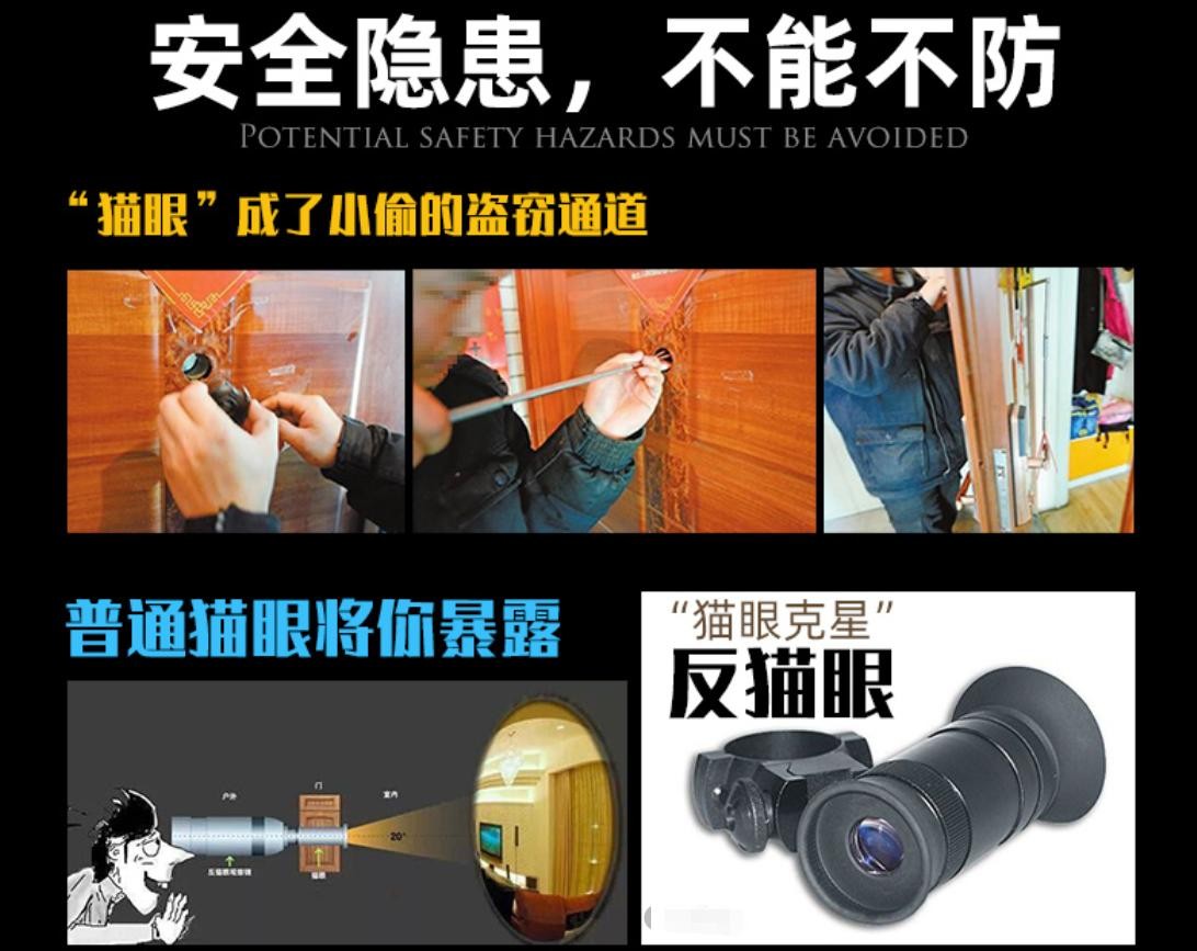 “猫眼反窥镜”就是专门针对“猫眼”而设计的一种窥视工具,也被人们称为“猫眼”的克星。将它放在“猫眼”上,就可以从门外看到屋内的情况,即使在光照条件不好的夜晚,门外的人也能将室内画面尽收眼底。