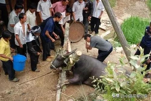 到了出殡的那天要杀上一头牛或是一头猪,又或者两者兼有,以家境殷实与否而定。或依照死者生前要求而定。杀牛时一定要一刀毙命,事成后屠夫可获得几十斤牛肉作为奖赏,否则要罚款几十至上百元。