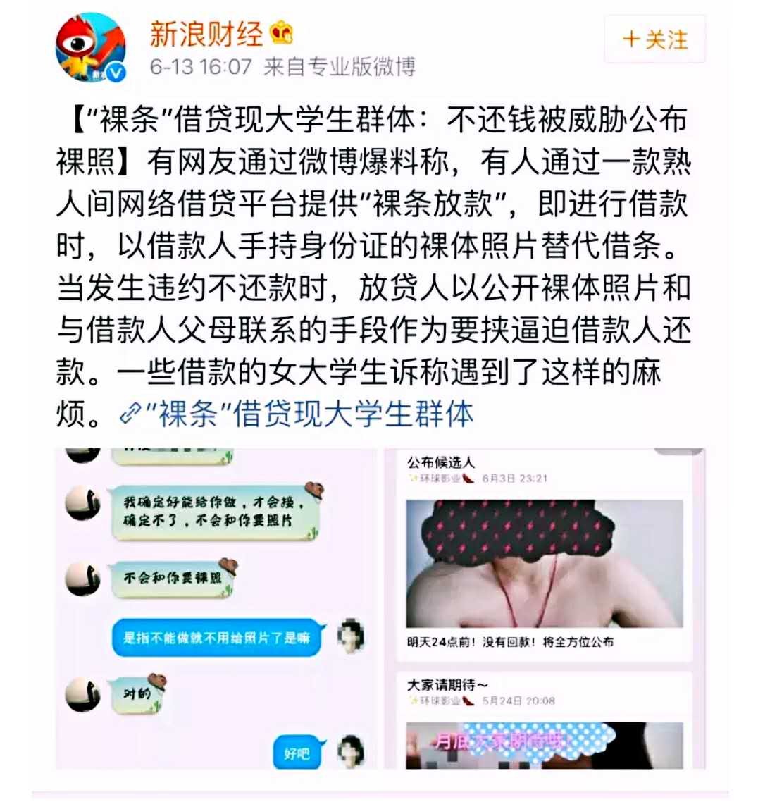 渭南青年网(特约撰稿/刘孟德)近日,裸条放款、裸条贷成为网上热词。即在校园借款时,以借款人手持身份证的裸体照片替代借条,当发生违约不还款时,放贷人以公开裸体照片和与借款人父母联系的手段作为要挟逼迫借款人还款。