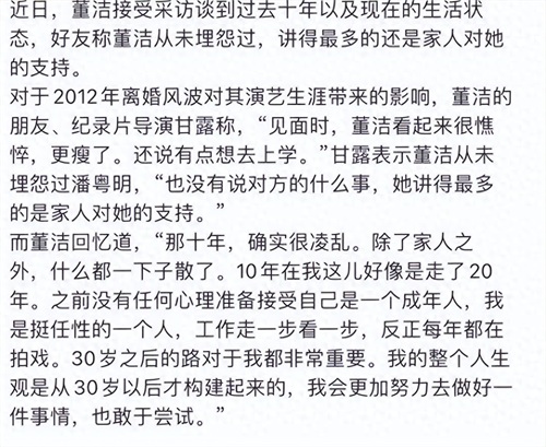 事情的起因是近日董洁在某杂志采访时,其好友甘露在采访文字里提到“我能感觉到这件事对她打击很大,她很坦诚,没有说埋怨过什么,也没有说对方的什么事,她讲得最多的是家人对她的支持”。