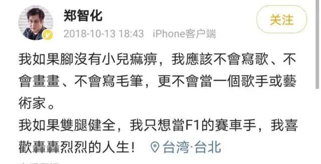 殊不知,郑智化却表示如果不是因为身有残疾,他不会写歌,也不会选择当歌手,他喜欢轰轰烈烈的人生,如果身体健康或许他会做个赛车手。