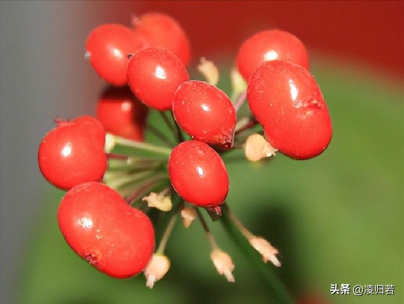 这种成串的红色小珠子,其实是人参的果实,被称为人参子,也有人称之为人参果。如果用两个字来形容它的外形,“绛珠”无疑是最形象且文艺的称呼。
