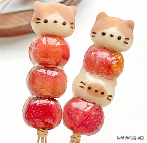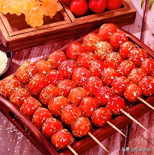 糖葫芦,又叫冰糖葫芦,起源于南宋时期,是一种将野果用竹签串成串后蘸上麦芽糖稀的小吃。这种糖稀在遇风后会迅速变硬,形成了糖葫芦独特的外表。糖葫芦在北方冬天尤为常见,通常以山楂为主要原料,串成后蘸上糖稀,冻硬后食用,口感酸甜且冰凉。