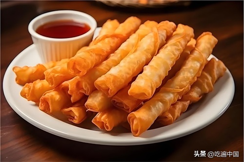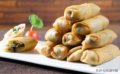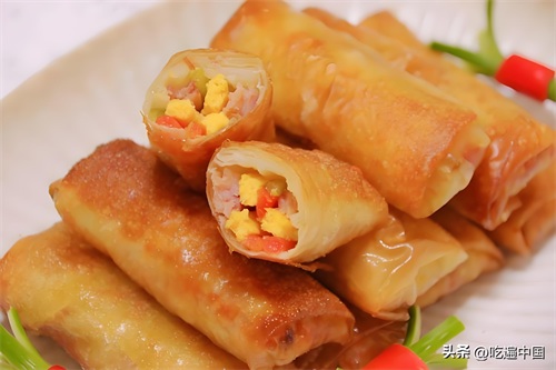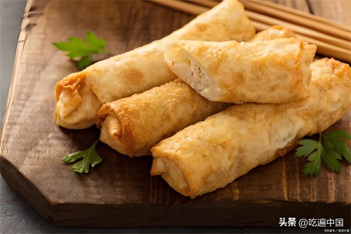 炸春卷是一种以春卷皮为主料,通过油炸制作而成的传统美食。 春卷皮通常由面粉制成,内填充有各种食材,如肉类、蔬菜和调味料,吃起来香酥美味,营养又很丰富,所以成为农家的招牌菜品。