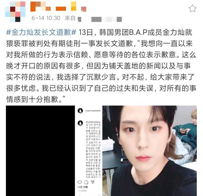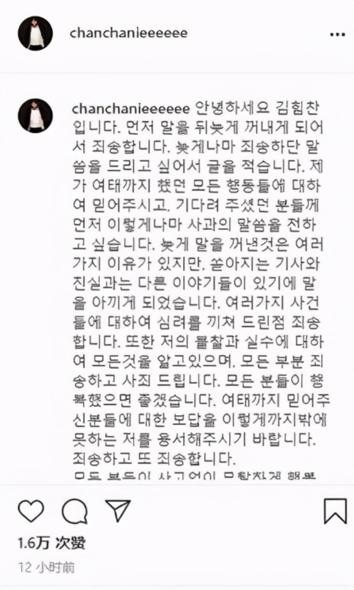 本以为这些事情渐渐偃旗息鼓了,金力灿却突然在今天上午于自己的社交主页上发布了一篇道歉信。