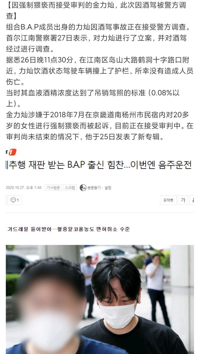 除此之外,在金力灿被韩国相关部门提起公诉期间,他还因为酒驾再上了一次新闻,让人无语。