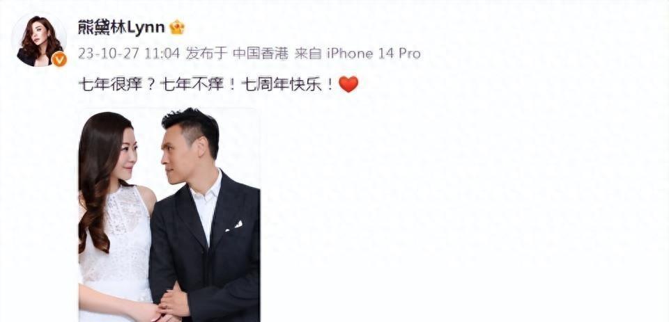 10月27日上午,熊黛林在社交平台上晒出与老公郭可颂结婚7周年的照片,并发文庆祝这一特殊日子。她调侃道:“七年很痒?七年不痒!七周年快乐!”这条微博一经发布,立即引来了众多粉丝的关注和祝福。