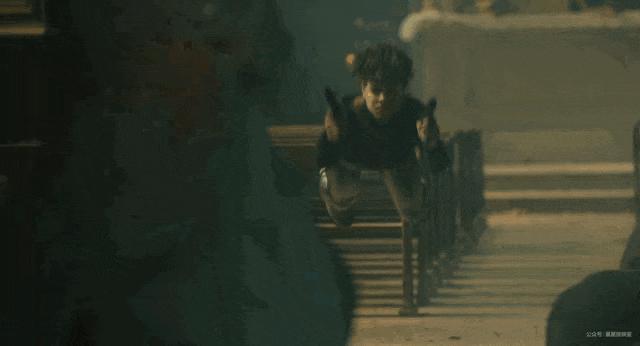 一身白西装倜傥利落,手持双枪火力交替,低机位仰拍,把车到山前必有路的快意恩仇狠狠拿捏。