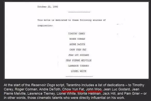 昆汀拍的第一部电影《落水狗》,就在剧本前页公开致敬了吴宇森和周润发。