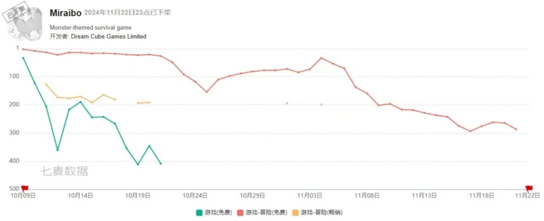 《Miraibo Go》在24年10月10日上线海外,但没有太显眼的市场表现。以美区市场为例,游戏拿到了iOS免费榜最高第34名,iOS冒险分类畅销榜第128名的成绩,后续数据也不好看。